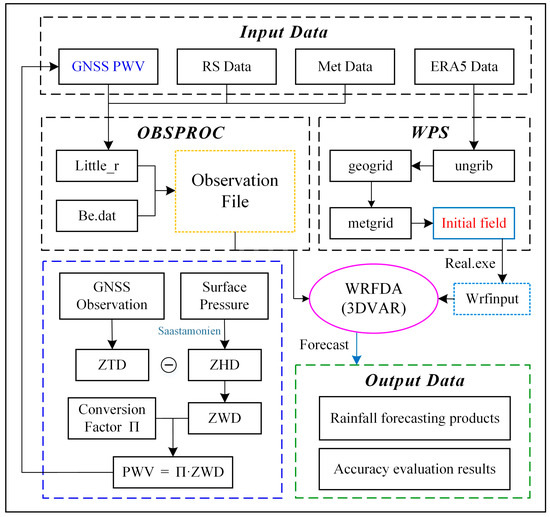 Flow chart of GNSS-assisted WRF model rainfall forecast platform experiment.