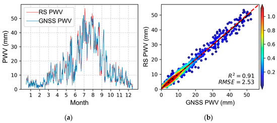 (a) Comparison of RS PWV and GNSS PWV long time series in Shaanxi Province in 2021; (b) RS PWV and GNSS PWV scatter density map.