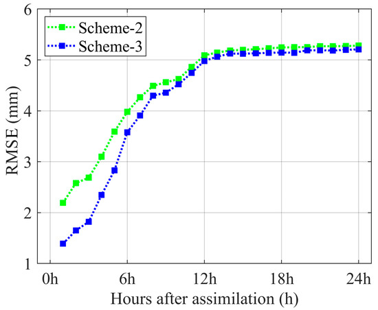 Hourly RMSE of rainfall forecast results for Schemes 2 and 3, compared to WRF no-data-assimilation scheme (Scheme 1), at 1 h to 24 h after data assimilation.
