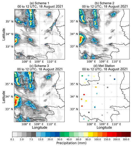 Comparison of 12 h accumulated rainfall forecast results for (a) scheme 1, (b) scheme 2, (c) scheme 3 on 00 to 12 UTC 18 August 2021, as well as (d) the observed data from meteorological stations.