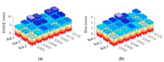 Comparison of (a) RMSE and (b) bias statistical results of rainfall forecasts with different schemes at seven meteorological stations.