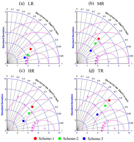 Comparison of the forecast accuracy of (a) LR, (b) MR, (c) HR and (d) TR rainfall levels in different schemes (Taylor statistical chart).