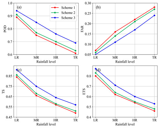Comparison of (a) POD, (b) FAR, (c) TS, and (d) ETS for different rainfall levels of three schemes in 2021.