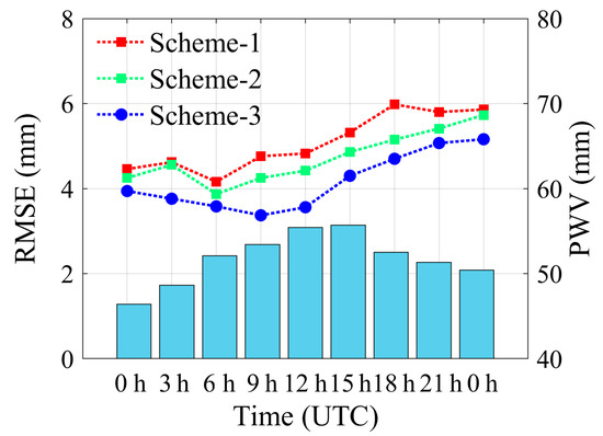 To evaluate the effect of GNSS-derived PWV magnitude further, quantitatively, on the forecast accuracy of rainfall of the WRF model, the average RMSE and the mean GNSS-derived PWV values of the forecast results of different schemes at the station every three hours are compared, as shown in Figure 10. It can be seen that the RMSE of the forecast results of three schemes generally decreases with increasing PWV. The statistical results also indicate that the PWV values from small to large are divided into three groups, namely, [40, 45), [45, 50), and [50, 55), resulting in statistical results of comparing the PWV of each group with the average RMSE of rainfall. The RMSE of rainfall is lowest in the group [50, 55) at 3.58 mm. Based on the results, the magnitude of PWV has a significant impact on the forecast accuracy of rainfall in the WRF model.