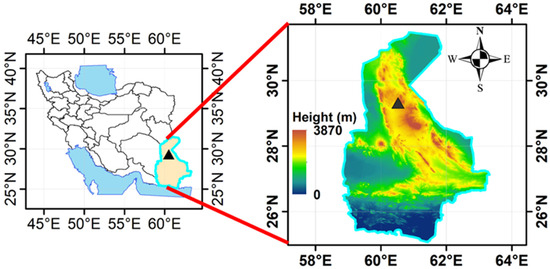 Topography of the Sistan Basin (southeast Iran) with the synoptic weather stations of Zahedan City (marked with black triangle).