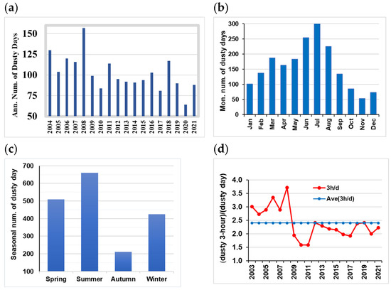 (a) Annual, (b) monthly, and (c) seasonal number of dust events and (d) number of 3 h dust events on dusty days at Zahedan station from 2004 to 2021.