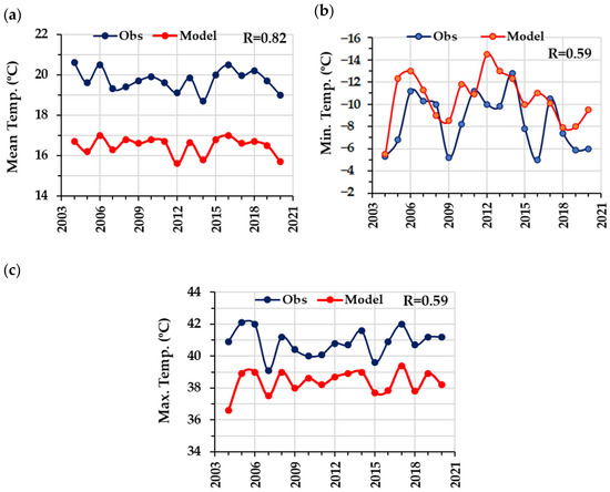 (a) Annual mean, (b) minimum, and (c) maximum air temperature during 2004–2020 at Zahedan station by WRF simulation (red line) and by measured data (black line).