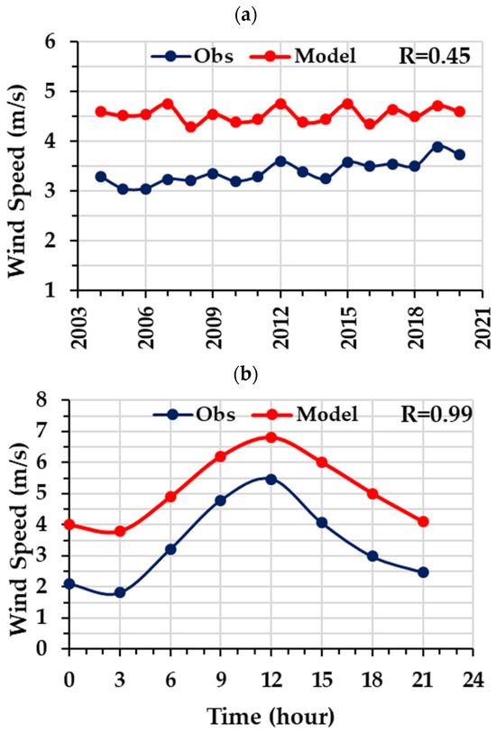 (a) Variation in mean annual wind speed and (b) mean diurnal variation in the simulated 10 m wind speed (m/s) in UTC time at Zahedan station in 2004–2020.