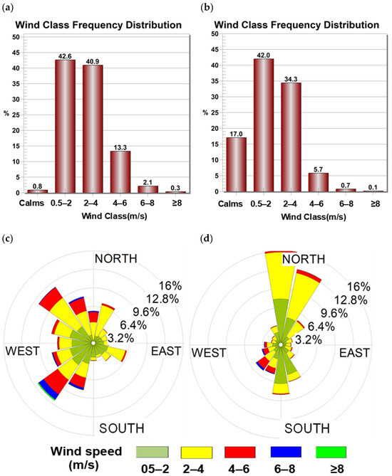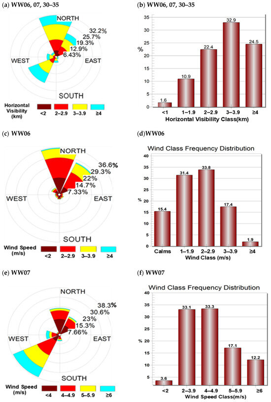 Figure 8c,d display the wind rose patterns and frequency distribution of each wind speed class associated with code 06. Around 36% of occurrences were linked to north winds, 27% to northeast winds, approximately 6% to northwest winds, and over 15% to calm wind conditions (Figure 8c).