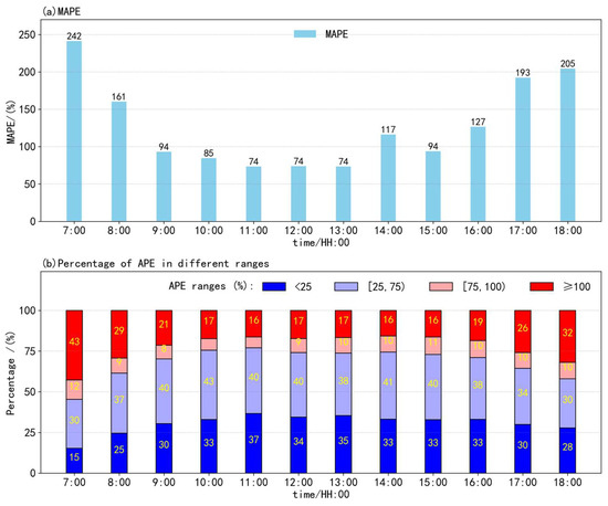 Moreover, APEs and BEs are calculated using forecasts and observations obtained at 15 min intervals. The occurrence percentage of APEs is calculated within four error ranges: those below 25%, between 25% and 75%, between 75% and 100%, and above 100%. The APE below 25% (above 100%) is taken to indicate a favorable (unfavorable) forecast, while an APE between 25% and 100% is regarded as a neutral forecast. Furthermore, the occurrence percentage of BEs is calculated within two error ranges: those below 0 W/m2 and above 0 W/m2. The percentage of BEs below 0 W/m2 (above 0 W/m2) greater than 50% indicates that the predictions are likely to underestimate (overestimate) the observed value.