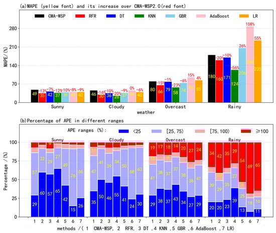 In this study, the MAPE and the APE are calculated using the observed and predicted solar radiation with 15 min intervals. This method very strictly analyzes the performance of the NWP model, which requires the NWP model to be able to accurately capture and predict small variations in weather and solar radiation over a short period of time (e.g., within 1 h). Therefore, a different method is introduced to calculate the MAPE and the APE, as described in reference [44]. First, the observed and predicted daily total solar radiations are obtained by summing 15 min solar radiation values from observations and CMA-WSP v2.0 predictions, respectively, over a day. Then, the MAPE and the percentage of the APE below 25% are calculated using the daily total solar radiation between January and December 2022 and between August and November 2023 (Figure 9), which are compared with the performance of the WRF model using ECMWF and GFS as the initial field [44]. The MAPEs of the CMA-WSP v2.0 are lower than those of the WRF model in most months; in particular, the percentages of the APE below 25% exceed 74% for the CMA-WSP v2.0 in March, July, and August 2022. This indicates that the performance of the CMA-WSP v2.0 in predicting solar radiation is good and valuable for business applications. Furthermore, it is found that the KNN, RFR, and DT models can improve the performance of the CMA-WSP v2.0 under different weather conditions. Among them, the KNN model performs best, especially in cloudy and rainy conditions. It is known that solar radiation simulations for the NWP model can be less accurate on days with extensive cloud cover or rain [43]. Therefore, the findings of this study are very valuable to improve the solar radiation prediction of the NWP model under cloudy and rainy conditions and to increase the efficiency of solar resource utilization. This study is an experiment applied to the photovoltaic power plant in Guizhou, China, and the experiment will be further applied to other photovoltaic power plants as much as possible. However, it is necessary to consider the economic costs associated with the business application of ML models, including the cost of data collection; the need for high performance computing resources, maintenance, and updates of the models; and the implementation of the model in real-world scenarios.