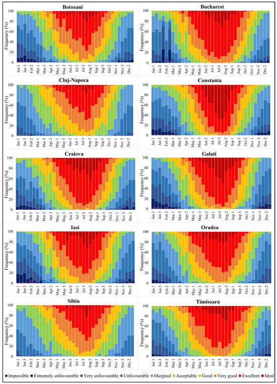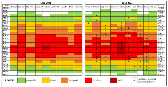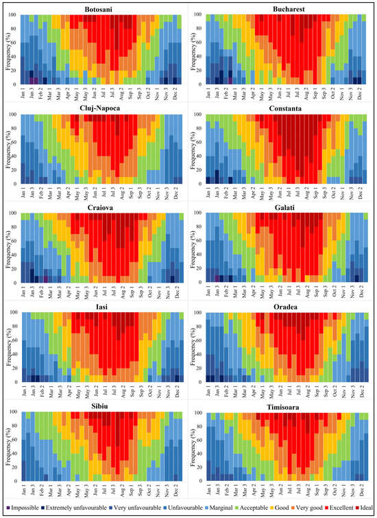 Over the shorter and more recent period (2012–2021), dominant Acceptable or better conditions for open-air recreational and tourism activities were detected for most cities from the second decade of March or even the first one for Cluj-Napoca and Iași. They lasted until the first decade of November, or later for three cities (Constanța, Sibiu, and Timișoara) (Figure 2). Compared to the long period, Very Good or higher suitability conditions can begin one decade earlier in eastern cities (Galați or Iași) or up to three decades later in central and western cities (Oradea, Sibiu, and Timișoara). Also, a shortage of the upper suitability conditions was detected at the end of the season. Thus, Good conditions characterized most locations except for Sibiu, where Acceptable conditions were dominant for the last decade of September. The Ideal conditions were present only in Constanța, and their average of only two decades over the long period grew to five decades in the recent period (Figure 2).