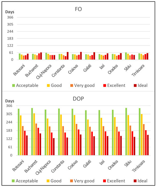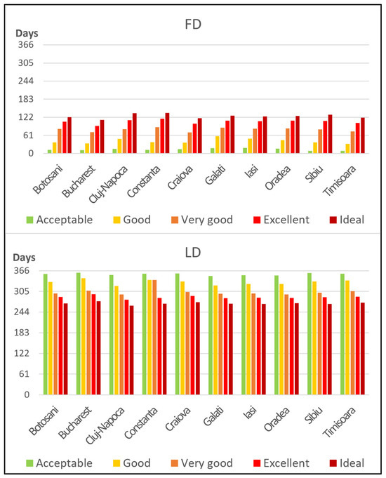 The earliest occurrences of FD are noted in the Acceptable class, from early January, ranging from the 9th (Timișoara and Sibiu) to the 19th day of the year (Iași). Conditions classified as Good indicated considerable variability among different stations, with FD observed in February, starting from 3 February (day 34) in Bucharest and extending to 27 February (day 58) in Galați. Very Good conditions emerge in March, spanning from 10 March (day 70) in Craiova to 29 March (day 89) in Constanța, while Excellent conditions are present between 2 April (day 93) in Bucharest and 26 April (day 117) in Constanța. Ideal conditions were identified between 22 April (day 113) in Bucharest and 17 May (day 137) in Constanța (Table 3 and Figure 6, up).