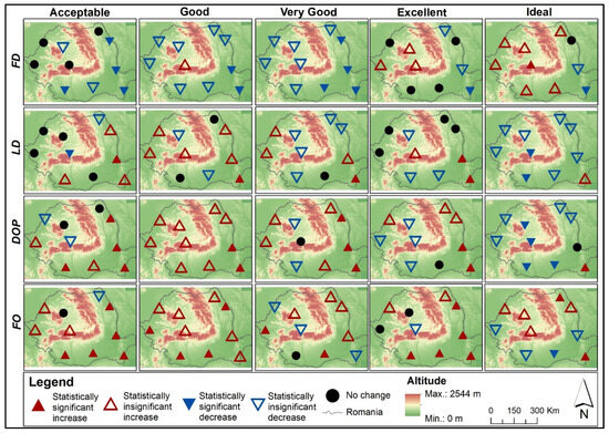 Over the 61 years considered, for most cities, a general decreasing trend was detected in the FD of Acceptable, Good, and Very Good classes, which means a general shifting of these conditions earlier in the year. The LD indicated an increasing trend for lowlands, especially for those located in the Southern and Eastern regions of the country, mainly for Good and Very Good conditions. Significant changes were detected in the Southeast, including the Black Sea coastline. The changes in the FD and LD led to an extension of the DOP, which is confirmed by the dominant increasing trends of DOP for most classes. The trends identified are significant in the extra-Carpathian regions, especially for the Acceptable, Good, and Excellent classes. The Ideal comfort class had a dominant increase in the FD and a dominant decrease in the LD and DOP. The only exception was for the Black Sea seaside region, which recorded opposite trends, with a significant increase in the DOP (Figure 7 and Table S3). The highest Sen’s slope was calculated for Constanța, where FD indicated a decreasing trend for each class. The most prominent was the Good conditions class, which decreased by 9 days/10 years. LD increased more than 4 days/10 years for Good and Excellent conditions. DOP increased for Good class with more than 13 days/10 years, and FO with almost 6 days/10 years of Ideal conditions. Consistent changes were also recorded in Galați, with increasing trends in FO and DOP, Sen’s slope values ranging between 3 and 8 days/10 years, and decreasing trends in FD, with values falling between 2 and 6 days/10 years, for Acceptable, Good and Very Good comfort classes (Table 4 and Table S3).