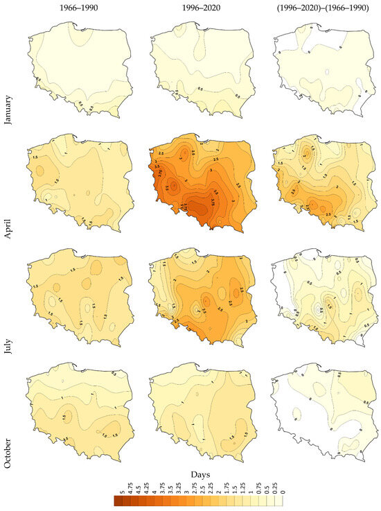 - Frequency of WD days in Poland—the monthly number of days that were warm and dry on at least one of the 48 stations in Poland.