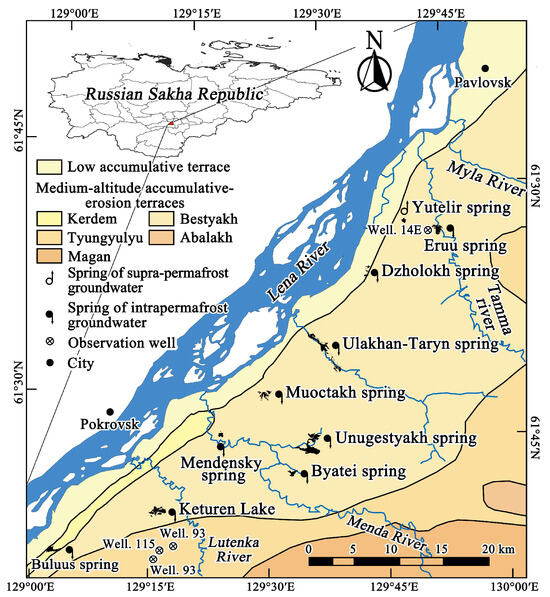 The study area is located on the Bestyakh Terrace on the northeast side of the Lena River in Central Yakutia (129°00′ E~130°00′ E, 61°30′ N~61°58′ N), as shown in Figure 1. The low-lying part of the terrace is formed by alluvial sand and gravel. The main part is formed by periglacial alluvium, overlying aeolian formations [45]. The thickness of Quaternary sediments ranges from 20 to 86 m. The southern part of the Bestyakh Terrace is covered by Cambrian limestone, and the northern part, by Jurassic sandstone. The Cambrian limestone dips northward beneath the Jurassic sandstone [46].