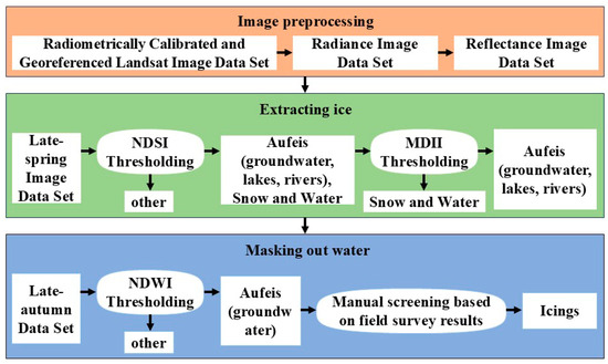 As icing is characterized by a distinct spectral signature, its detection is possible using remote sensing approaches. We used Landsat 4–5 TM, Landsat 7 ETM+, Landsat 8 OLI, and Landsat 9 OLI at a 30-m resolution to map icing distribution and changes in maximum surface areas each April from 2002 to 2022 (https://www.usgs.gov/landsat-missions, accessed on 15 October 2023). For the investigation period from 2002 to 2022, we selected Level-2 Surface Reflectance Collection 1 Tier 1 images due to their superior data quality. These images, with a georegistration root mean square error of less than 12 m, are ideal for time-series analyses [44]. To ensure the maximum surface areas of the icings were captured, satellite images from every April were used. These images may show some snow cover, which needed to be distinguished from icings. Furthermore, surface water icing (including lakes and rivers) also needed to be distinguished. Scenes with cloud cover below 30% were selected. For the Landsat 8 OLI and Landsat 9 OLI datasets, when cloud cover ranged from 5% to 30%, it was effectively reduced to below 5% by employing the built-in cloud masking layers within Google Earth Engine (GEE) [47]. For the Landsat 4–5 TM and Landsat 7 ETM+ datasets, scenes from the closest time period were used to fill the regions covered by clouds [9]. The images used were Level 1 terrain corrected (LT1) products, with radiometric and geometric corrections completed. Some scene data were lost due to a scan line corrector (SLC) failure in June 2003, and the “fix Landsat 7 scan line error” tool in ArcGIS was employed for restoration. For icing data extraction, we utilized image algebra to devise a three-stage remote sensing method, which could make the extraction of icing surface areas more accurate and efficient. This approach works because of the significant differences in reflectance and emittance of electromagnetic radiation between liquid and solid water (Figure 2) [9].