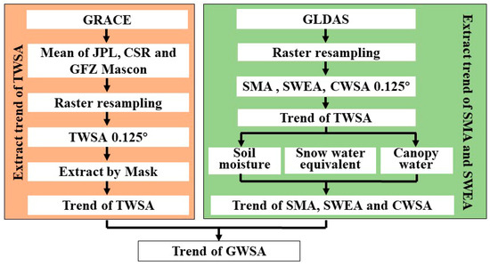 where is the anomaly of groundwater storage (mm). is the anomaly of terrestrial water storage obtained by the GRACE/GRACE-FO satellite (mm), and and are the anomalies of soil moisture (mm) and snow water equivalent (mm), obtained by GLDAS NOAH. represents the anomaly of total canopy water storage (mm).