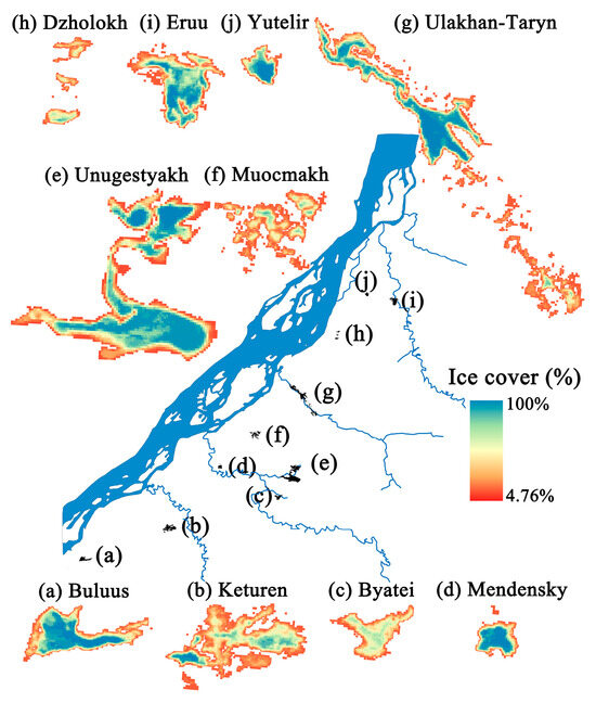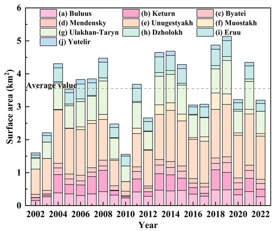 Icings are quite common in the study area and occur in different sizes. Between 2002 and 2022, a total of 210 icing events were recorded in the study area. The average surface area of the icings was 0.36 ± 0.04 km2. Among these events, 20 were large icings, with a surface area of over 0.90 km2, all of which were from Unugestyakh. There were 38 medium-sized icings, with surface areas ranging from 0.45 to 0.90 km2. These icings were largely from Keturen, Eruu, and Ulakhan-Taryn. The 152 small icing events, with surface areas smaller than 0.0036 km2, were found in other regions. Icings smaller than 0.0036 km2 were not identified due to the 30 m pixel resolution of Landsat images. As the data were constrained by the pixel resolution, smaller icings may not have been recognized.