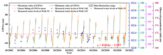 To validate the accuracy of the GWSA data, we compared measured groundwater level data from groundwater observation wells in the study area with the GWSA data, as shown in Figure 6. Since the study area is located in a permafrost region, it is challenging to observe groundwater levels, resulting in a discontinuous record of monitoring data. Therefore, data from Well 14E (October 2014 to May 2015) and Wells 53, 93, and 115 (the October of each year from 2003 to 2021) with relatively complete data were selected for comparison. From October 2014 to May 2015 and from October 2014 to May 2016, both the GWSA and measured groundwater levels showed increases with good consistency. The difference in annual rise was only 0.44 to 0.61 m. During the icing growth period from 2002 to 2022 (from October to May of the following year), the GWSA grew slightly each month, with a rate of change of 0.02 cm/month. Each growth period saw a noticeable increasing trend. The largest amplitude (130.94 cm) occurred in the period from October 2021 to May 2022, while the smallest (42.05 cm) occurred between October 2017 to May 2018.
