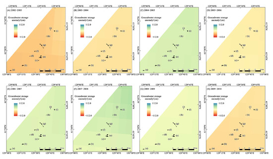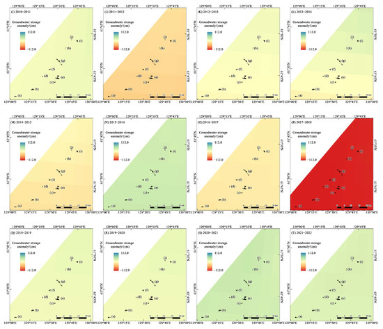 Spatial variation characteristics of interannual GWSA on the Bestyakh Terrace on the northeast side of the Lena River in Central Yakutia, Russia during the icing growth period (from the October of the current year to the May of the following year) from 2002 to 2022 (A–T) (a. Buluus, b. Keturen, c. Byatei, d. Mendensky, e. Unugestyakh, f. Muocmakh, g. Ulakhan-Taryn, h. Dzholokh, i. Eruu, and j. Yutelir).
