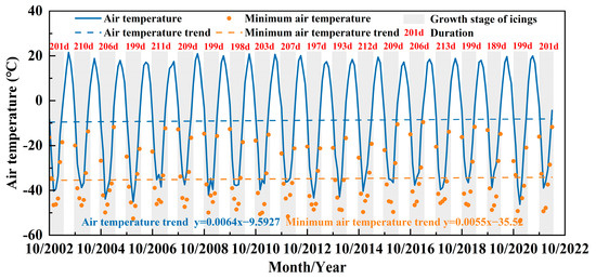 From 2002 to 2022, the study area got warmer, with a rate of temperature change of 0.08 °C/year and an annual average temperature of −8.27 °C, as shown in Figure 8. The highest annual average air temperature (−6.60 °C,) occurred in 2020, while the lowest (−9.77 °C) was in 2004. To further explore the impact of negative temperatures during the icing growth period, we calculated the changing trend of monthly minimum temperatures, which increased with a rate of change of 0.06 °C/year, 0.02 °C/year lower than the rate of temperature change for the entire year. The lowest temperature in the study area over the past 20 years was recorded on January 23, 2021, with a daily minimum temperature of −53.8625 °C. In the study area, the duration of the icing growth period ranged between 189 to 213 days, with the longest period (213 days) occurring in 2017–2018 and the shortest (189 days) in 2019–2020. Influenced by climate warming, the icing growth period in the study area showed a decreasing trend during the 20 years, with a rate of change of −0.26 days/year.