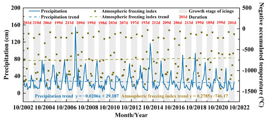 To further investigate the impact of air temperatures during the icing growth period, we calculated the changing trend of negative accumulated temperatures, as shown in Figure 9. Over the years, the annual atmospheric freezing index rose with a rate of change of 21.99 °C-day/year. The lowest atmospheric freezing index, measured at −5545.07 °C-day, was recorded in 2004–2005, while the highest, at −4497.32 °C-day, occurred in 2019–2020.