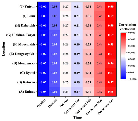 Heatmap depicting the correlation between the maximum surface area of icings on the Bestyakh Terrace on the northeast side of the Lena River in Central Yakutia, Russia, from 2002 to 2022, and the mean GWSAs for different periods (redder shades indicate a higher correlation and bluer shades indicate a lower or even negative correlation).