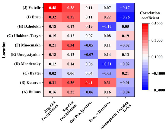 Previous studies have found a connection between icing development and early autumn precipitation [9]. To further reveal to what extent the size of icings is influenced by different months in autumn, we conducted a correlation analysis between autumn precipitation and icing surface areas for different month combinations in the study area from 2002 to 2022 (Figure 11). The results showed that the response of icing surface area in the Yutelir region from August to October was most sensitive to precipitation (r = 0.48, p < 0.01). This is because the main water source for icings in the region is suprapermafrost water, which is more susceptible to precipitation input. In contrast, other icings primarily rely on intrapermafrost water as their water source, resulting in a less sensitive response to precipitation and a weaker influence from precipitation.