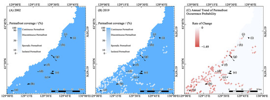Permafrost coverage (A,B) and annual trends in permafrost occurrence probability (C) from 2002 to 2019 on the Bestyakh Terrace on the northeast side of the Lena River in Central Yakutia, Russia (a. Buluus, b. Keturen, c. Byatei, d. Mendensky, e. Unugestyakh, f. Muocmakh, g. Ulakhan-Taryn, h. Dzholokh, i. Eruu, j. Yutelir).