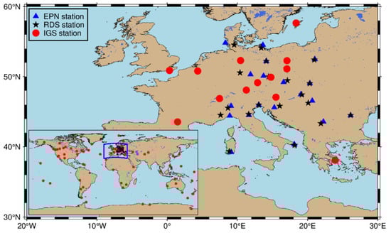Distribution of selected IGS stations (red dots) around the world, EPN stations (blue triangles), and RDS stations (black pentagons) in Europe.