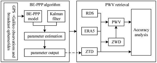 The flowchart of ZTD/PWV data retrieval based on BE-PPP.