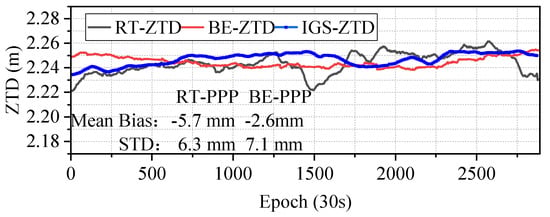 To comprehensively compare the differences between the real-time ZTD estimated using RT-PPP and BE-PPP, the mean bias and STD of the 30-day RT-ZTD and BE-ZTD were determined and are plotted in Figure 6. Following the principle of (interquartile range), after excluding the outliers, the data availability was 95.8% for both BE-ZTD and RT-ZTD. Figure 5 shows that the mean bias of the RT-ZTD is −0.79–0.72 cm, while that of BE-PPP is −6.83 cm to 4.49 cm. The STD of the RT-ZTD is 0.13–1.12 cm, and that of BE-PPP is 0.28–2.46 cm. The average bias value is −0.04 cm for the RT-ZTD, and the average STD value is 0.6 cm, while the average bias value is -1.11 cm for the BE-ZTD, and the average STD value is 1.07 cm. In summary, the ZTD products with real-time estimation of RT-PPP are characterized by their high accuracy and stability; however, the difference in the average STD between the BE-ZTD and RT-ZTD is only 4.7 mm, which indicates that it is feasible to use real-time BE-ZTD estimation to compute NWPs when the network link is outage. This is also consistent with the study of Pan et al., which reported a standard deviation of 15.7 mm for the inverted ZTD with real-time PPP based on the Galileo broadcast ephemeris [].