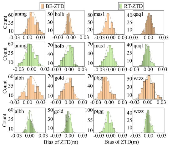Distribution of ZTD differences between RT-ZTD and BE-ZTD from 8 stations.