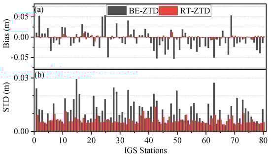 Mean bias (a) and STD (b) of BE-ZTD and RT-ZTD (DOY 356) from 80 IGS stations.
