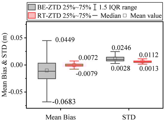 The boxplot of mean bias and STD for RT-ZTD and BE-ZTD.