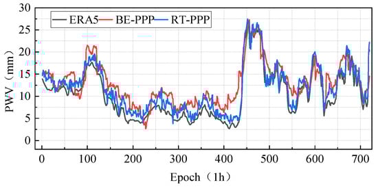 - Validation with ERA5: For the validation of the PWV derived from BE-PPP, the PWV series retrieved from RT-PPP and BE-PPP processing were compared with the series from ERA5. The temporal resolution of the RT-PPP and BE-PPP PWV solutions was 30 s, while the PWV derived from ERA5 was 1 h. To avoid additional interpolation, only PWV retrieval at common epochs of each PWV series was taken into account for the comparison. Figure 7 shows the PWV comparisons of BE-PPP, RT-PPP, and ERA5 for 720 consecutive hours at the EPN station SAS2.