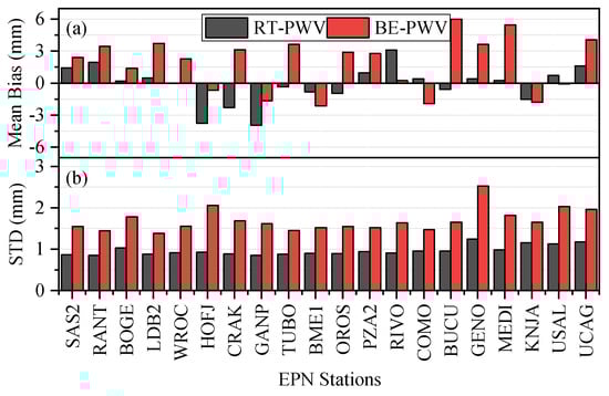 The PWV retrieved with RT-PPP (blue) and BE-PPP (red) both exhibit excellent agreement with the ERA5 PWV (black), while the RT-PWV outperforms the BE-PWV. The mean bias is −1.41 mm for the RT-PWV and −2.41 mm for the BE-PWV. The STD values of the RT-PWV and BE-PWV are 1.02 mm and 2.53 mm, respectively. The difference in the STD values between the RT-PWV and BE-PWV is at the millimeter level. To further compare the differences between BE-PWV and RT-PWV, data from 20 EPN stations were used for a statistical analysis in this paper. As shown in Figure 8, the mean bias of the BE-PWV is −2.14–6.01 mm, while the mean bias of the RT-PWV is −3.98–3.11 mm. The majority of the stations exhibit a higher mean bias for the BE-PWV compared to that of the RT-ZTD, although there are a few stations where the BE-PWV outperforms the RT-PWV. Subgraph (b) shows the variation in the STD among the stations. For the BE-PWV, the STD ranges from 1.39 to 2.53 mm, while for the RT-PWV, it ranges from 0.85 to 1.25 mm. The stability of the RT-PWV is observed to be higher compared to that of the BE-PWV. The mean biases for the RT-PWV and BE-PWV from the 20 stations are −0.14 mm and 1.84 mm, respectively. Additionally, the STDs for the RT-PWV and BE-PWV are 0.96 mm and 1.69 mm, respectively. These findings further support the aforementioned conclusion that the disparity between RT-PWV and BE-PWV is negligible. Both RT-PPP and BE-PPP meet the accuracy requirements of a 1 mm target and 5 mm threshold value for real-time PWV products applied to NWP forecasting []. The results indicate that the difference in PWV derived from the BE-PPP and RT-PPP solutions is small, while BE-PPP demonstrates an accuracy and stability sufficient enough to serve as a viable alternative solution to RT-PPP.
