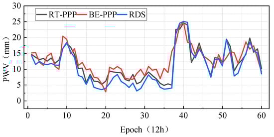 Figure 9. The time series of PWV derived from BE-PPP, RT-PPP, and RDS at station SAS2 during DOY 335–364 of 2022.