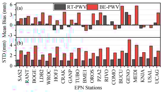 Figure 10. Mean value (a) and STD (b) of the PWV differences for BE-PPP and RT-PPP with respect to RDS at 20 EPN stations during DOY 335–364 of 2022.