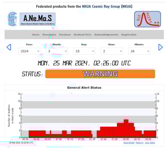 - The second email was sent on 25 March 2024 at 02:28 UT, 2 min later than the notification that was issued on 25 March 2024 at 02:26 UT. This notification stated that three neutron monitor stations—LMKS, THUL, YKTK—detected a GLE event. In this case, the time delay of 2 min was within the typical time of stations to send data.
