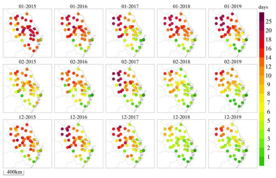 Distribution of PM2.5 pollution days in January, February, and December in the Yangtze River Delta from 2015 to 2019.