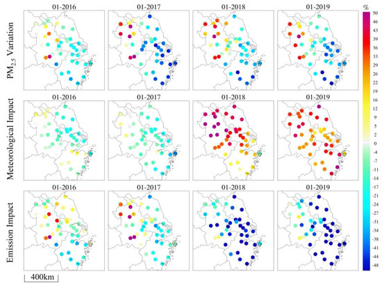 January witnessed relatively severe PM2.5 pollution in the YRD. While PM2.5 pollution was mainly concentrated in and occurred in the southern coastal areas of the YRD in the winter of 2015, significant improvement was observed from 2016 to 2019. Nevertheless, high PM2.5 concentrations persisted in the inland areas of Anhui and western Jiangsu. Notably, our study highlights a striking trend: high-PM2.5-concentration regions shifted from coastal areas towards inland areas.