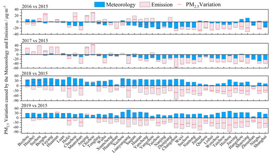 Meteorological conditions and pollution source emissions have direct effects on the variation in PM2.5 concentration. We carried out a quantitative analysis of the impact of meteorological and emission changes on PM2.5 concentration. The analysis method was as described by Xu et al. [32,53]. This study took 2015 as the base year, and the specific calculation formula was as follows: