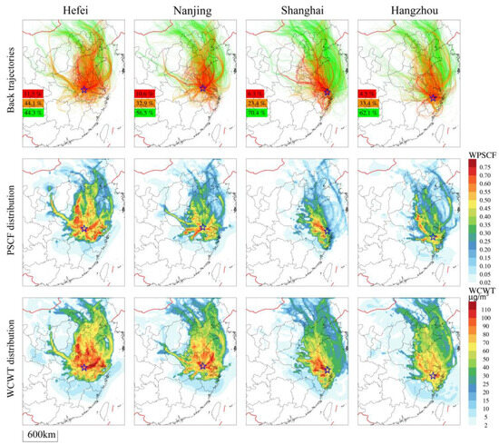 The contribution of PM2.5 concentrations at different pollution levels was significant to the overall concentration, and the heavier the pollution, the larger the contribution (Figure 2b). Thus, we employed the meteorological field from the WRF-NAQPMS simulation to analyze the backward trajectories of air masses and potential sources. To comprehensively assess the long-term impact of the potential sources on the YRD and the pollution transport pathways, Hefei, Nanjing, Hangzhou, and Shanghai were selected as key representative cities to conduct PSCF and CWT analyses of all 72 h backward trajectories from 2015 to 2019 in January.