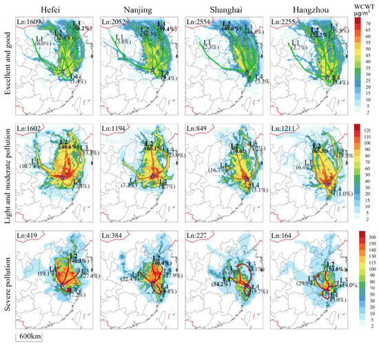 To further explore the PM2.5 sources and the main pollution transmission pathways, we conducted trajectory clustering and corresponding WCWT analyses under excellent and good, light and moderate, and severe PM2.5 pollution in Hefei, Nanjing, Shanghai, and Hangzhou, in order to clearly analyze the transport sources and different channels of PM2.5 at different grades, summarize the main channels, and provide suggestions for the PM2.5 prevention paths. Therefore, there were four types of transportation channels (Figure 6), namely, L1 (inland channel), L2 (coastal channel), L3 (marine channel), and L4 (near local channel), according to the trajectories classified for the key representative cities in the YRD in the above context (Figure 5). In the clean pathways, the long-distance transport marine channel L3 had a relatively high proportion. The ocean effectively had no emission sources, and the air masses of marine channel L3 with the low-concentration PM2.5 and the fast transmission speed were conducive to the diffusion and concentration reduction of PM2.5 in the YRD.