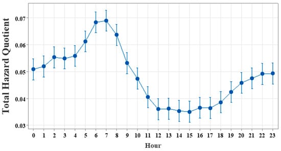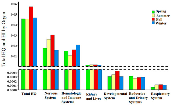| Hazard Index (HI) | 2.13 × 10−2 | 1.65 × 10−2 | 1.52 × 10−3 | 3.37 × 10−4 | 2.80 × 10−4 | 9.70 × 10−5 |
