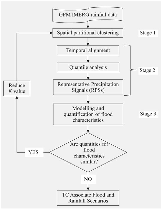 The proposed three-stage workflow analyzing TCs to derive design rainfall events is presented in Figure 1. Satellite precipitation estimates over the tropical cyclone provide rainfall time series for each pixel in the study area for the selected time window. A suitable clustering algorithm clusters the rainfall time series based on their temporal behaviour. For each output cluster, a temporal alignment and quantile analysis enable the selection of ‘representative precipitation signals’ (RPSs) that generalize the cluster’s rainfall temporal characteristics. The RPS is then the rainfall input for a flood model to examine the TC-related flood response characteristics. If similarities in flood response are observed for the RPSs, the number of optimal clusters could be reduced in the iteration of the procedure. If significant differences exist in the quantified flood characteristics, these rainfall signals are considered the best cluster RPSs, which are named TC-associate rainfall scenarios. The corresponding flooding characteristics are labelled the TC-associate flood scenarios to be used for improved and reliable TC-related flood hazard assessment. To maintain consistency with respect to risk management, the same labelling system is used, where three categories like extreme, intermediate, and least intense correspond to high, moderate, and low levels, respectively. A detailed explanation of the procedure is in Section 2.1, Section 2.2, Section 2.3, Section 2.4 and Section 2.5.