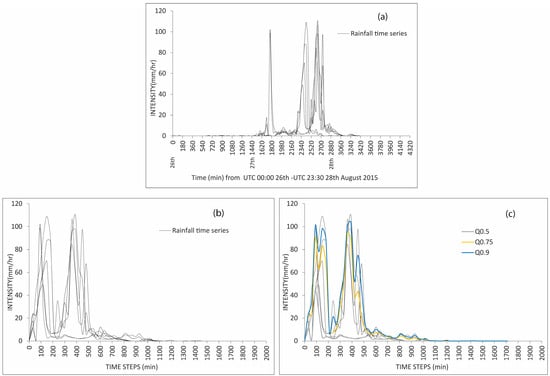 In the second stage, the pixel rainfall time series of the output clusters were translated into representative precipitation signals (RPSs) for input in the flood event model to predict flood response characteristics. The output clusters might be spatially distinct in the study area, introducing a challenge of varying rainfall starting periods for pixel time series in the same group since the TC was in motion, as shown in Figure 2a. To remedy the time alignment problem, the beginning of the TC’s precipitation was determined by introducing a starting threshold to remove silent periods and the antecedent rain, as illustrated in Figure 2b. A given threshold value was suitable for indicating the commencement of the TC’s rain if it preserved the cluster’s temporal rainfall behaviour elements, i.e., the number of peaks, duration, intensity, and total volume. The less intense clusters were likely small precipitation events disparate from the tropical cyclone [51], assumed non-flood-prone and therefore excluded from further analysis. Now that the rainfall time series were at a standard onset rainfall intensity, quantile measurements of position were applied to select the representative precipitation signals, as shown in Figure 2c. As the research interest was in rainfall extremes that may trigger extreme flooding, three quantile positions, i.e., 0.5, 0.75, and 0.9, labelled Q0.5, Q0.75, and Q0.9, respectively, were analyzed. The rainfall totals, intensity and duration of the quantile signals were compared to the original cluster time series to ensure that the RPSs were associated with realistic rainfall characteristics.