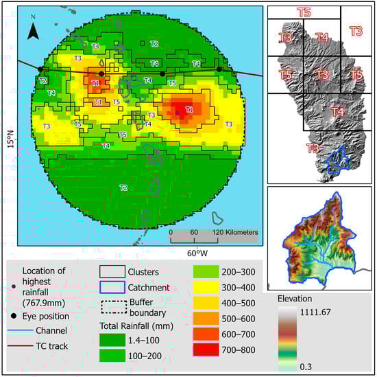 Natural disasters in the Caribbean region, particularly adversities caused by tropical cyclones (TC), date back many years. The global record of natural disasters places 15 Caribbean islands in the top 25 countries most vulnerable to tropical cyclone disasters [1]. The damage costs of these small island states may be minimal on a global scale; however, citizens are often highly afflicted because the losses suffered by some of these countries exceed their economies [2,3]. Recent occurrences of TCs during the annual North Atlantic hurricane season, which includes the Caribbean region, provide increasing evidence of varied TC rainfall activity within individual storms and between storms [4,5,6]. This variability makes TCs capable of causing complex patterns of heavy rainfall, such that inland/riverine and flash floods are experienced at different levels of severity on the islands. In addition, the TC rainfall structure is inherently non-homogenous, characterized by a cloud system comprising rainfall bands spiralling outward from the TC centre [7] and is highly influenced by the TC’s environment [8,9]. Therefore, improving long-term disaster preparedness and response strategies to account for the spatial–temporal variability of TC rainfall is essential for mitigating potential impacts.